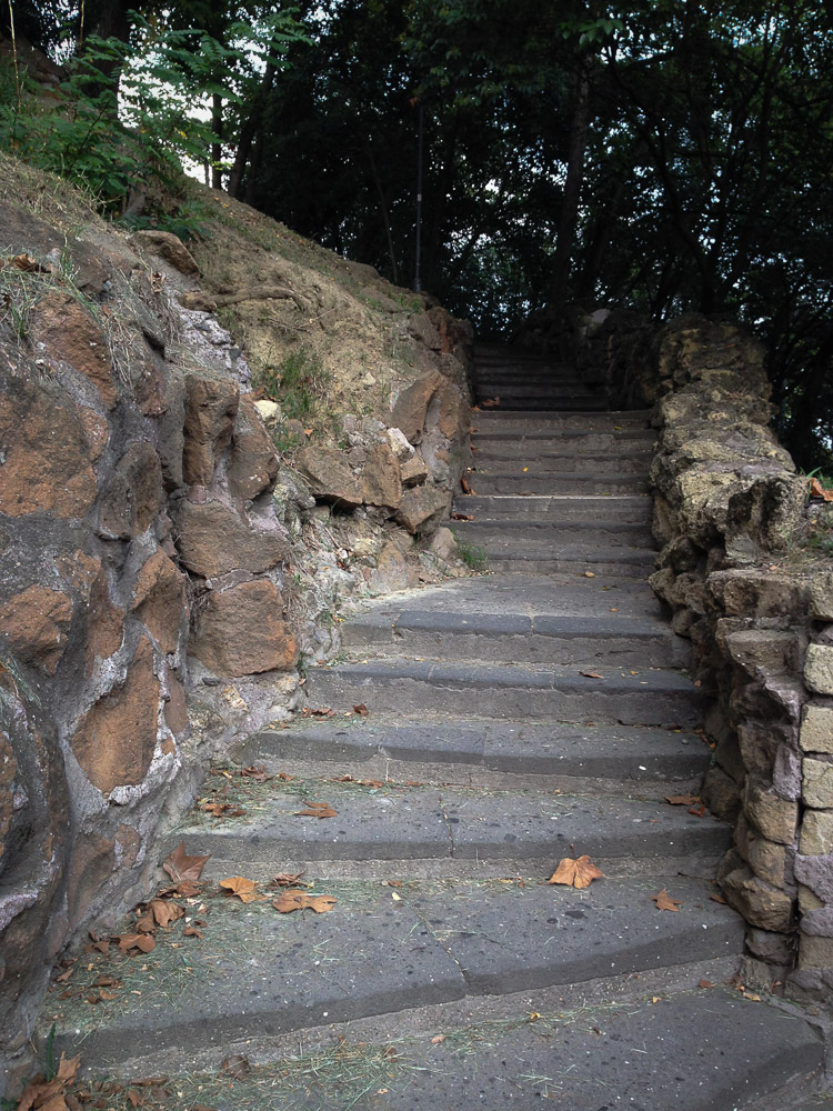 One of the gentler staircases. This shady path winds gradually up the hill.
